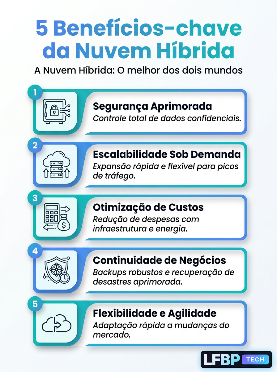 Este infográfico apresenta os 5 benefícios-chave da nuvem híbrida. Descubra como combinar nuvens pública e privada para maior flexibilidade, segurança e eficiência de custos.