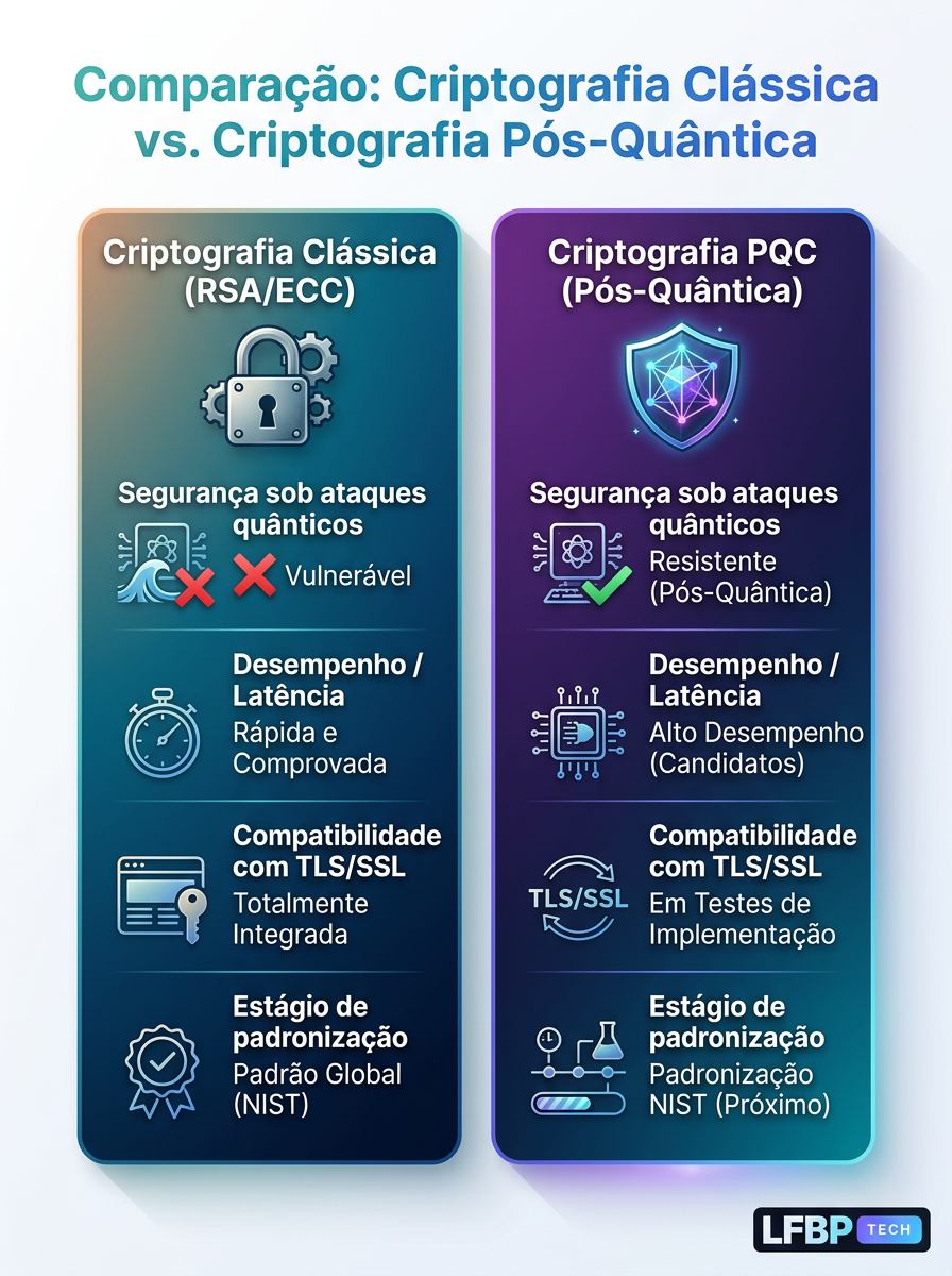 Este infográfico compara a Criptografia Clássica com a Criptografia Pós-Quântica, destacando usos e vulnerabilidades. Veja como a criptografia evolui para resistir a computadores quânticos.