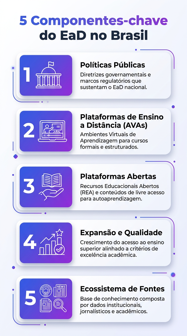 Este infográfico apresenta os 5 componentes-chave do EaD no Brasil. Veja como cada elemento impacta a educação a distância.