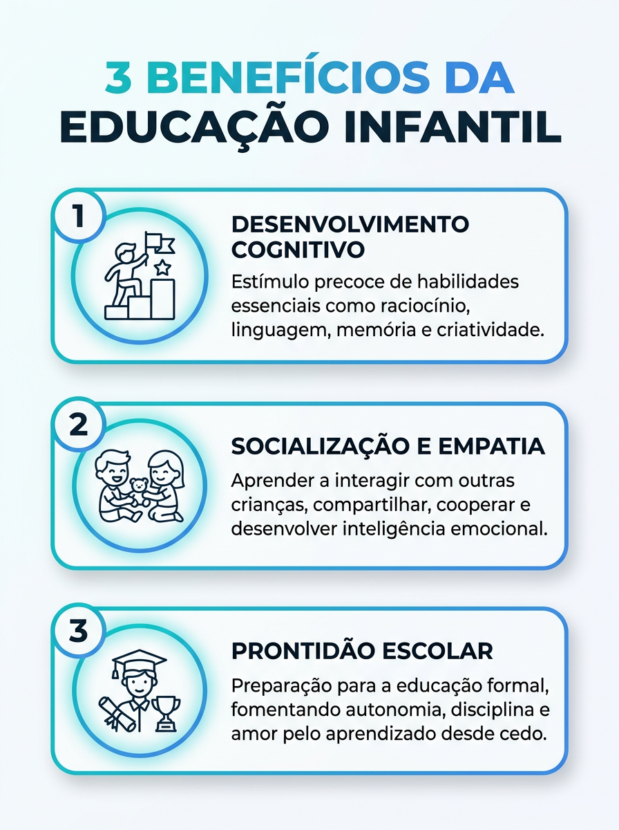 Este infográfico destaca os três benefícios da educação infantil. Entenda como o aprendizado precoce favorece o desenvolvimento das crianças.