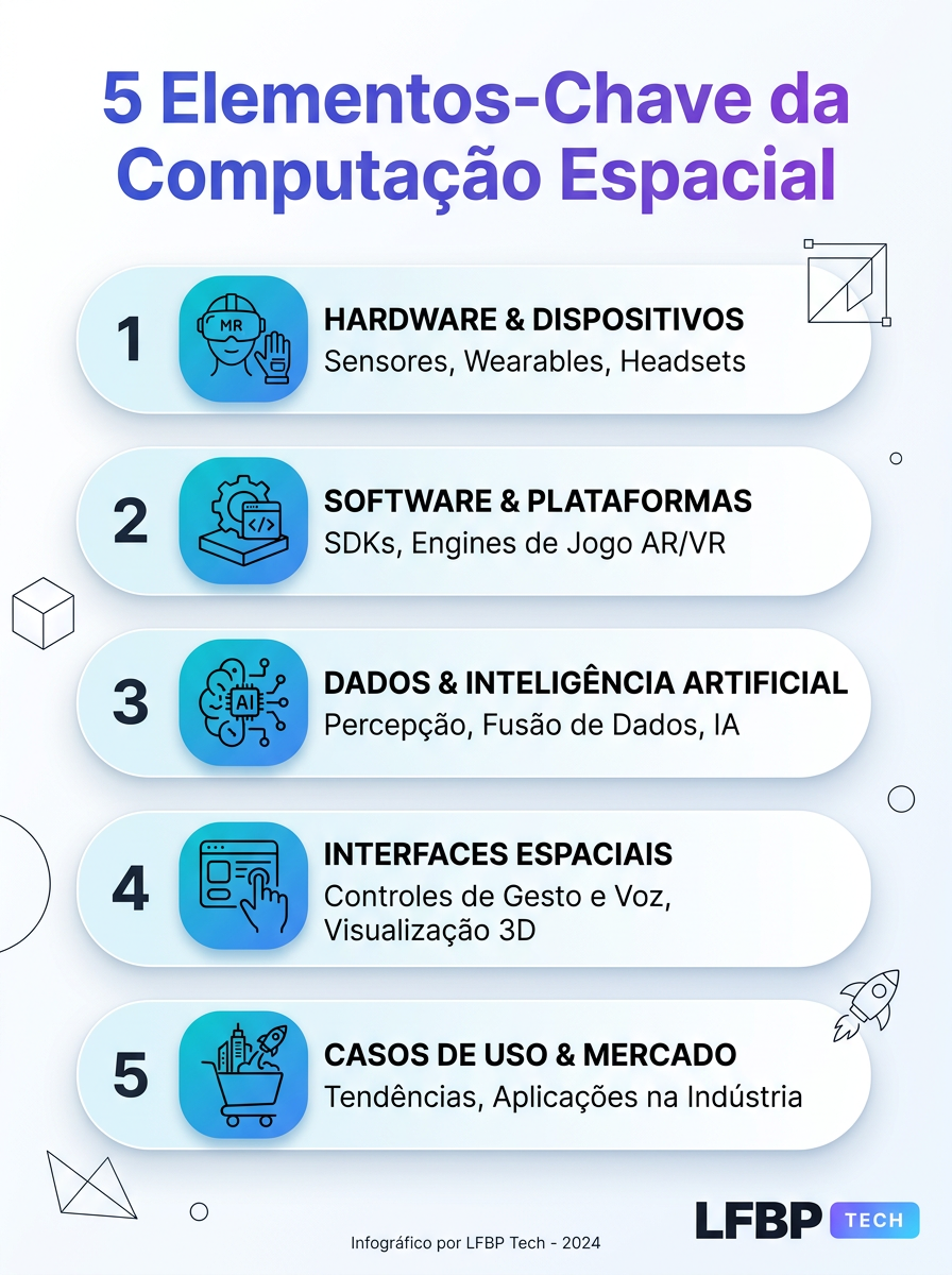 Este infográfico apresenta os 5 elementos-chave da computação espacial. Veja como cada elemento se conecta e contribui para o todo.